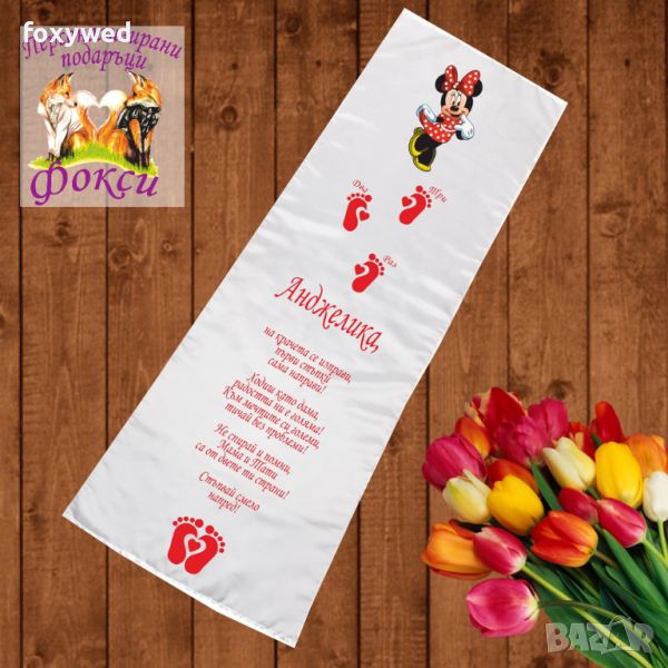 Платното за прощъпулник е изцяло персонализирано с текст пожелание, отпечатване на името на детето, любим герой и бебешки стъпки. При ваше желание може да се добави и датата на прощъпулника, като това няма да оскъпи продукта. Изработено е от плътен, непрозрачен, матов плат фин микрофибър,в бял цвят /100% полиестер/, с размери 50 х 150 см. Не се пързаля!