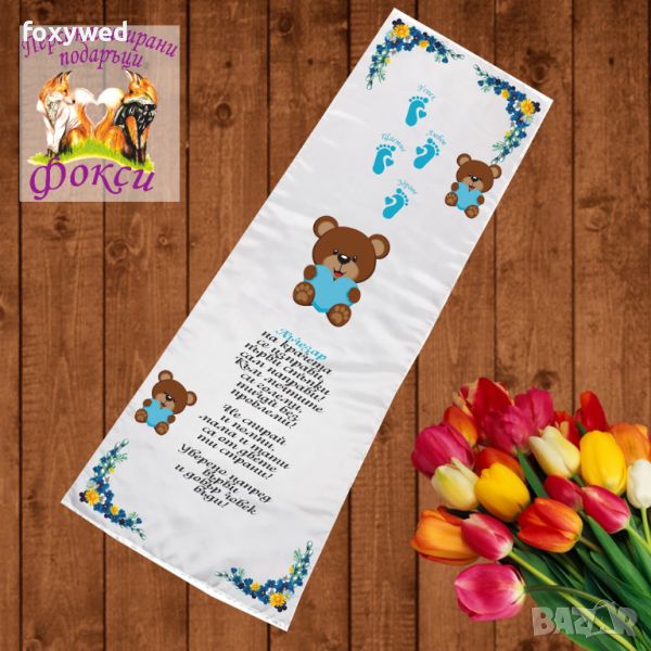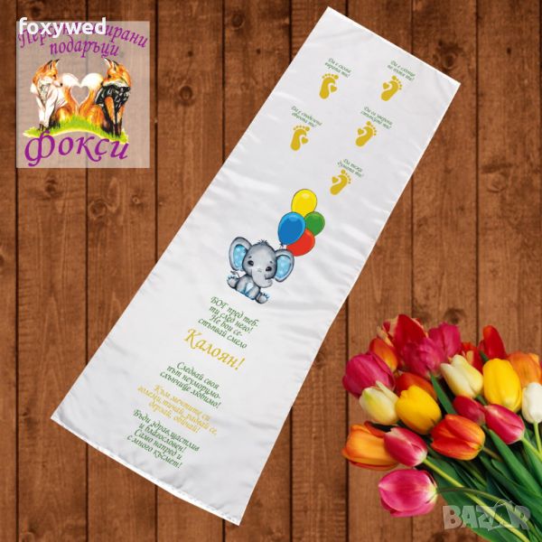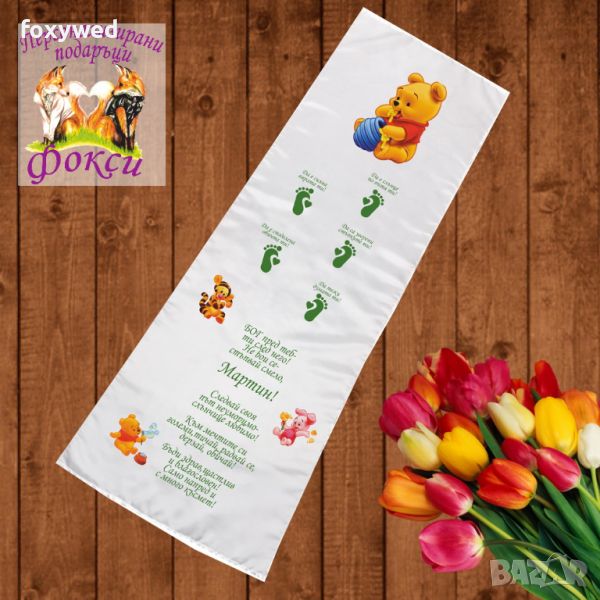 Платното за прощъпулник е изцяло персонализирано с текст пожелание, отпечатване на името на детето, любим герой и бебешки стъпки. При ваше желание може да се добави и датата на прощъпулника, като това няма да оскъпи продукта. Изработено е от плътен, непрозрачен, матов плат фин микрофибър,в бял цвят /100% полиестер/, с размери 50 х 150 см. Не се пързаля!