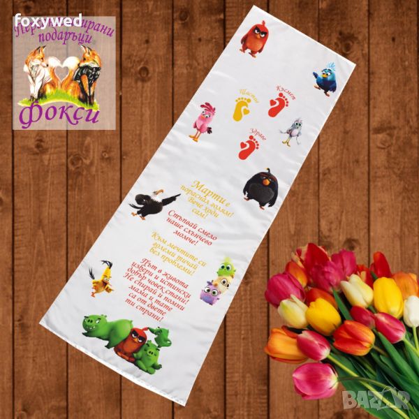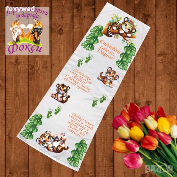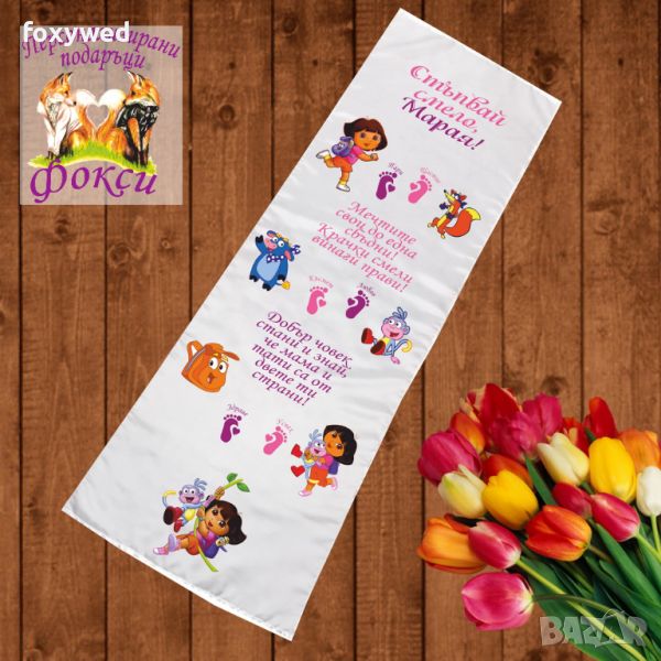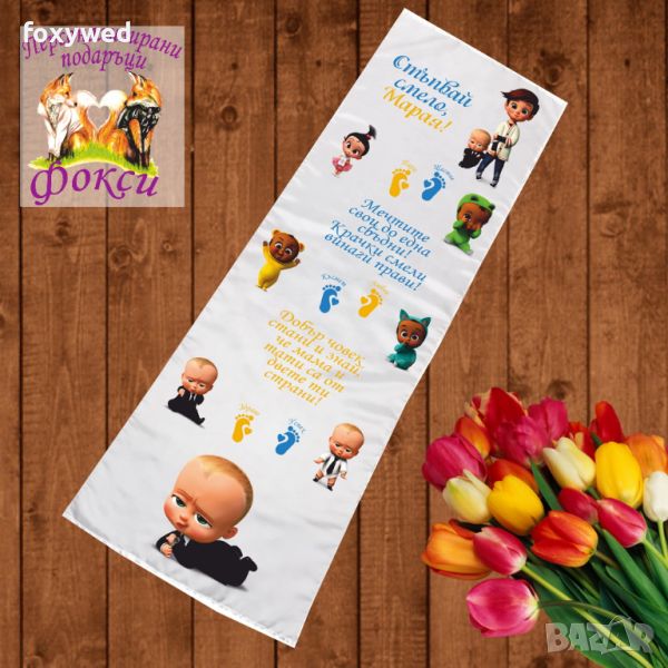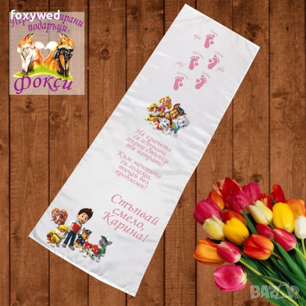 Платното за прощъпулник е изцяло персонализирано с текст пожелание, отпечатване на името на детето, любим герой и бебешки стъпки. При ваше желание може да се добави и датата на прощъпулника, като това няма да оскъпи продукта. Изработено е от плътен, непрозрачен, матов плат фин микрофибър,в бял цвят /100% полиестер/, с размери 50 х 150 см. Не се пързаля!