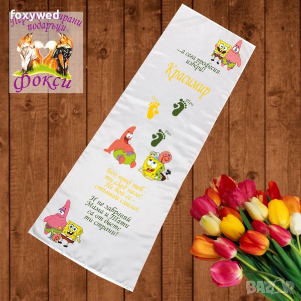Платното за прощъпулник е изцяло персонализирано с текст пожелание, отпечатване на името на детето, любим герой и бебешки стъпки. При ваше желание може да се добави и датата на прощъпулника, като това няма да оскъпи продукта. Изработено е от плътен, непрозрачен, матов плат фин микрофибър,в бял цвят /100% полиестер/, с размери 50 х 150 см. Не се пързаля!