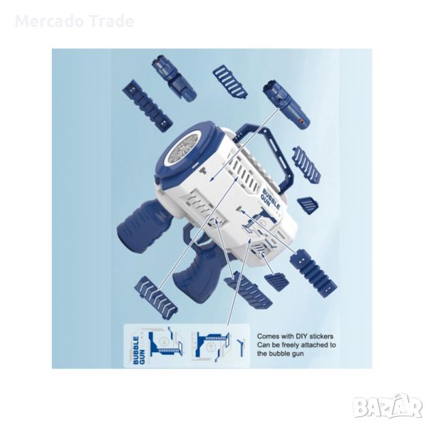 Пистолет за сапунени балони Mercado Trade, С резервоар, LED светлина, Син