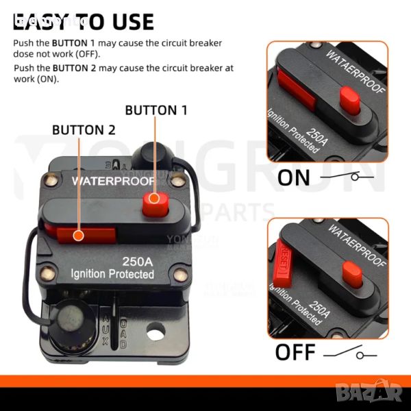 **Предпазете вашата аудио система, тролинг мотор или друго 12V-48V DC оборудване от претоварване и късо съединение с този надежден автоматичен прекъсвач!**
