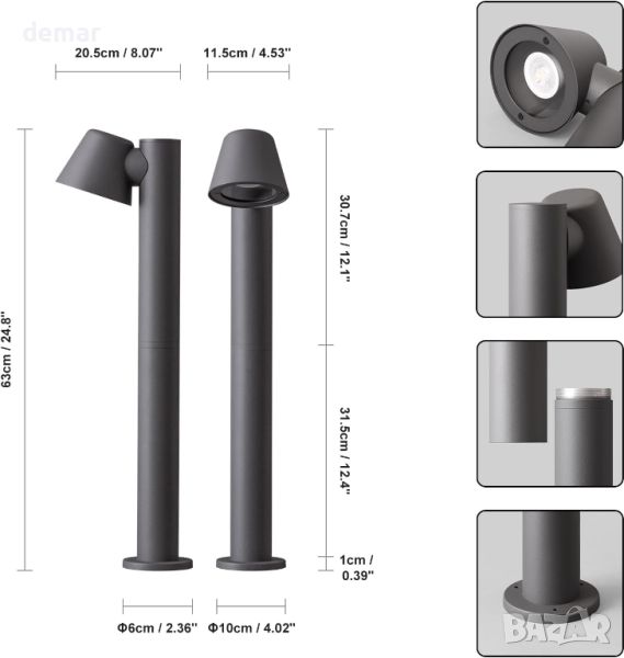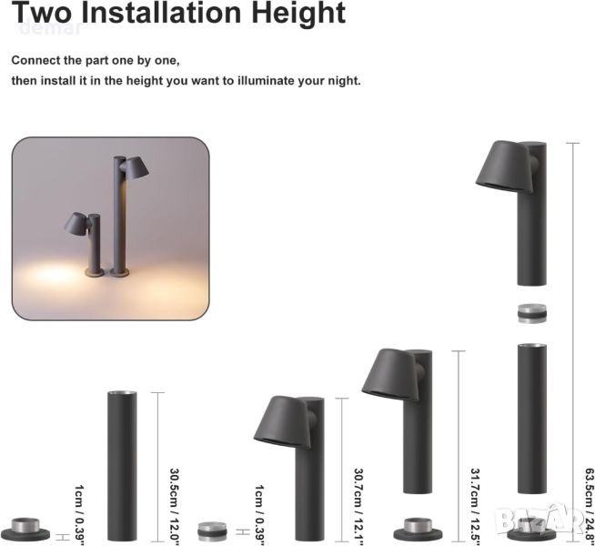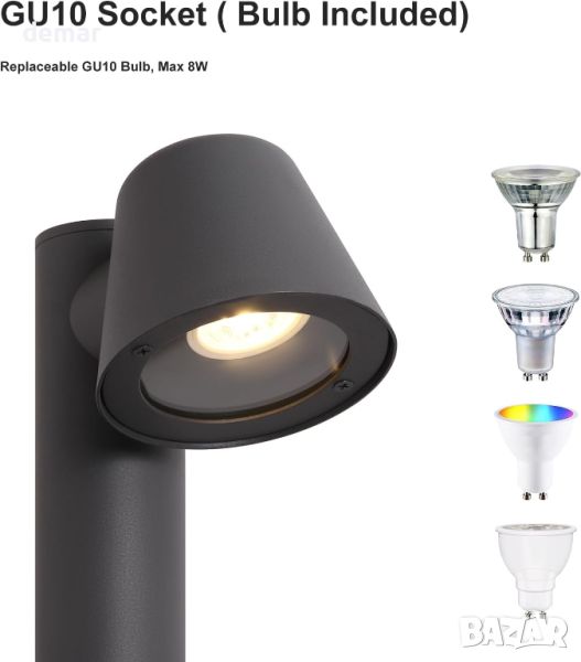 Тази градинска лампа е оборудвана със сменяема крушка GU10, предлагаща гъвкавост при персонализиране на осветлението. Включва 5W 3000K топла бяла крушка, но можете да я замените с до 8W LED крушка в студено бяло или други цветове според вашите предпочитания. За тези, които желаят регулируеми нива на осветеност, лампата може също да се трансформира в димируема стълбова лампа с подходяща димируема крушка и отделен димер (не е включен). С рейтинг IP44, осветителното тяло е изработено от издръжлив алуминий и закалено стъкло, което осигурява стабилна устойчивост срещу вода, топлина и прах. Той е идеален за осветяване на градински пътеки, алеи или вътрешни дворове през нощта и се предлага с две опции за височина – 630 мм/24,8 инча и 317 мм/12,48 инча – което позволява гъвкаво разположение и разнообразни настройки на осветлението.