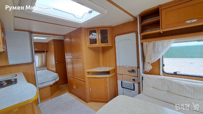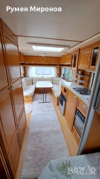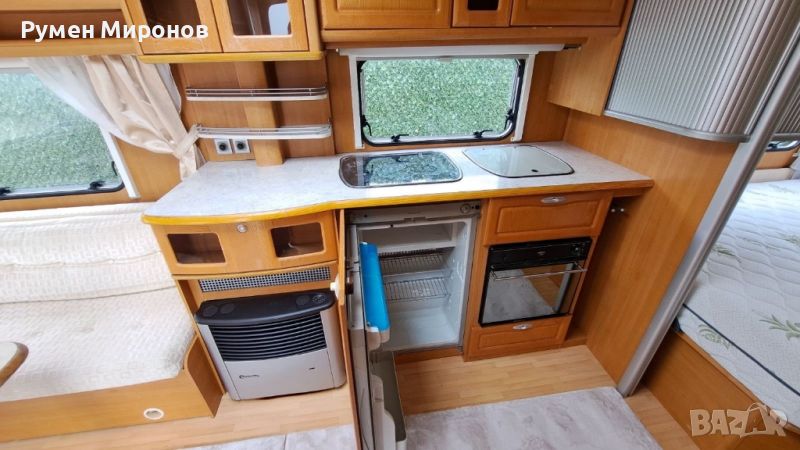 По средата газова отоплителна печка с обдухване на цялата каравана, хладилник с голяма камера, три газови котлони, мивка с топла и студена вода,