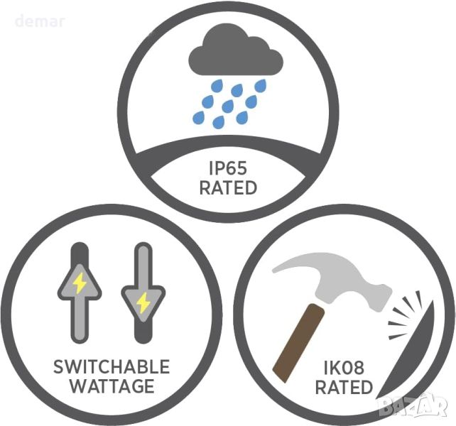 „Bright Source LED 2D Polo Fittings“ се отличава с елегантен, модерен дизайн и гъвкава функционалност с регулируеми цветови температури – изберете от 3000K, 4000K или 6000K, за да отговарят на всяка атмосфера или функционална нужда. В допълнение, тези фитинги предлагат регулируеми опции за изходна мощност от 9w, 14w и 18w, което позволява икономия на енергия и персонализиране на интензитета на светлината. Те произвеждат мощен диапазон на осветяване от 855 лумена при 9w до 1710 лумена при 18w, всички разпределени в широка област с ъгъл на лъча от 120° за равномерно осветление. Идеални както за вътрешна, така и за външна употреба, тези LED светлини са създадени да издържат по-дълго от CFL и са подкрепени от 1-годишна гаранция, която може да бъде удължена до 5 години с онлайн регистрация. Осветителните тела са сертифицирани по CE и имат рейтинг IP65 и IK08, гарантирайки издръжливост при различни условия на околната среда и атмосферни условия.