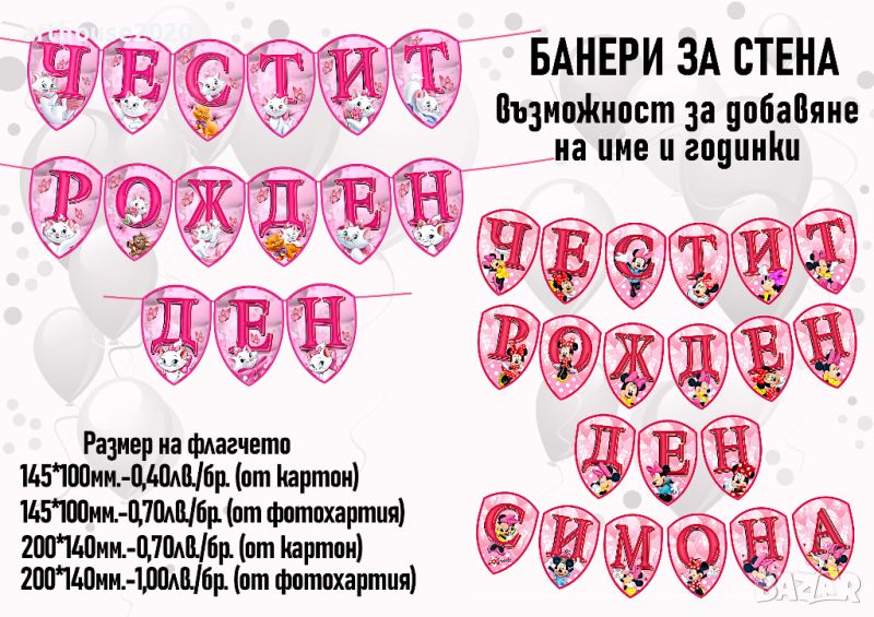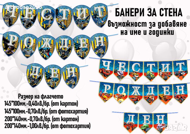 За празника на Вашето дете,изработваме банери за стена,покани,топери за мъфини,парти свирки с герои и др.Предлагаме фолиеви балони и разнообразие от дребни подаръчета, подходящи за поставяне в картонена торта.Вижте и нашите предложения за картонени торти с любими герои.Не се колебайте да се свържете с нас!Ще получите индивидуално отношение,качество и коректност.