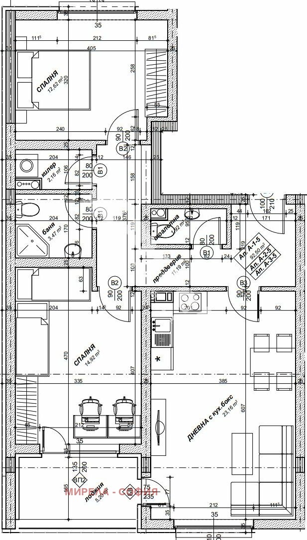 ЕТАП НА СТРОИТЕЛСТВО: завършен груб строеж (Акт 14); ОТОПЛЕНИЕ: конвекторни радиатори; Има 1 балкон/тераса; Предава се на шпакловка и замазка; Непреходен; ВИД СТРОИТЕЛСТВО: тухла; ЗАСТРОЕНА ПЛОЩ 92.50 кв.м; ПУСКОВ СРОК: 12.2026; ИЗЛОЖЕНИЕ: запад, североизток; СПАЛНИ: 2; БАНИ: 1; ДОГРАМА: Пет камерна PVC