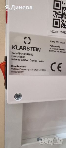 Продавам чисто нов инфрачервен отоплител Klarstein 300w може да се закачи на стената както в стаята така и в банята, отопля стаята или вашата баня без проблем, пробван е работи без проблем внос от Германия.