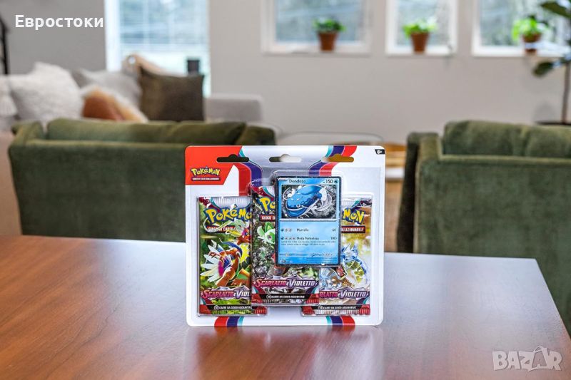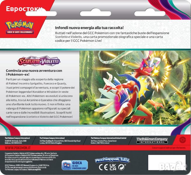 Включени са три пакета за разширение (всеки плик в разширението Scarlet and Violetto от Pokémon съдържа 10 карти и основна енергия, с три гарантирани холографски карти в плика).