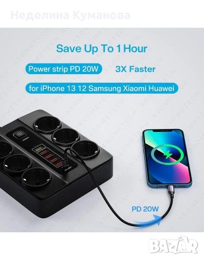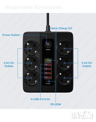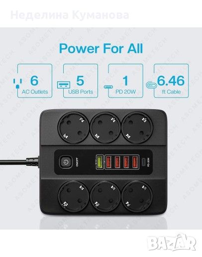 Power Socket QC3.0 разполага с 6 стандартни гнезда, които ви позволяват да свържете електрически уреди като компютри, телевизори, лампи и други. Този разклонител предлага 5 USB порта и 1 Type-C порт, които ви дават възможност да зареждате смартфони, таблети, лаптопи, Bluetooth слушалки и други USB- и Type-C-съвместими устройства.