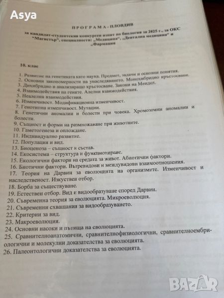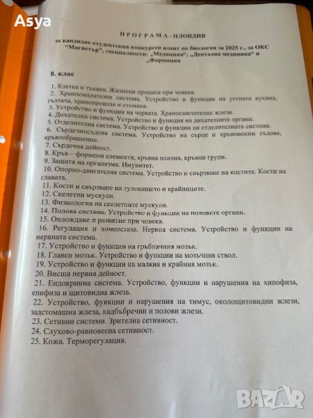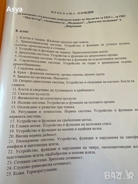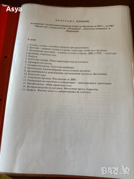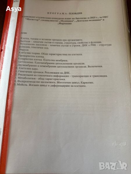 Разработени теми по биология за кандидат-студенски конкурсен изпит за ОКС Магистър, специалност ,, Медицина’м, ,,Дентална медицина’м и ,,Фармация’’. Папките са три броя за 8,9,10 клас. Цената е за папка 25 лв.