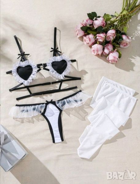 - Комплект сутиен с формата на сърца, прашки с дантелен колан и дълги бели чорапи.