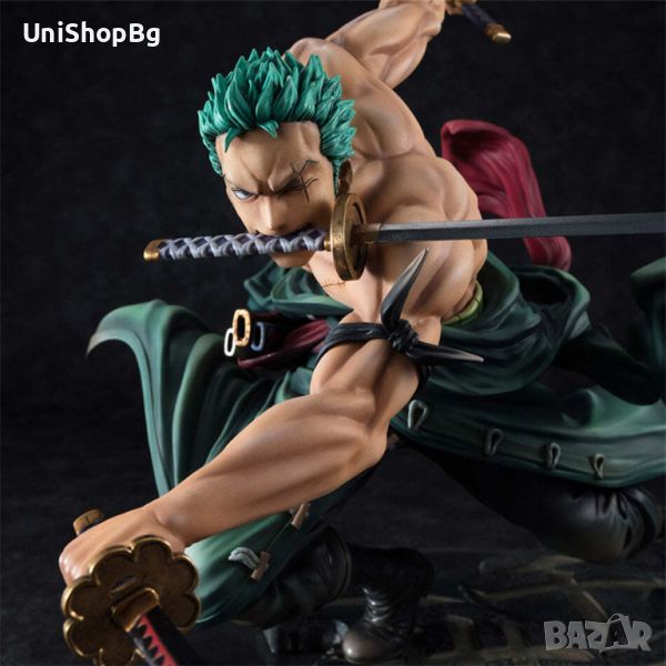 Възхитителна фигурка на Зоро от One Piece, представяща героя с неговите три меча, обвити в лилава материя. Изключително подробно изработена и реалистично представена, тази фигурка е идеалното допълнение към колекцията на всеки фен на анимето и мангата. Покажете вашата страст към света на One Piece с тази великолепна фигурка на Зоро!