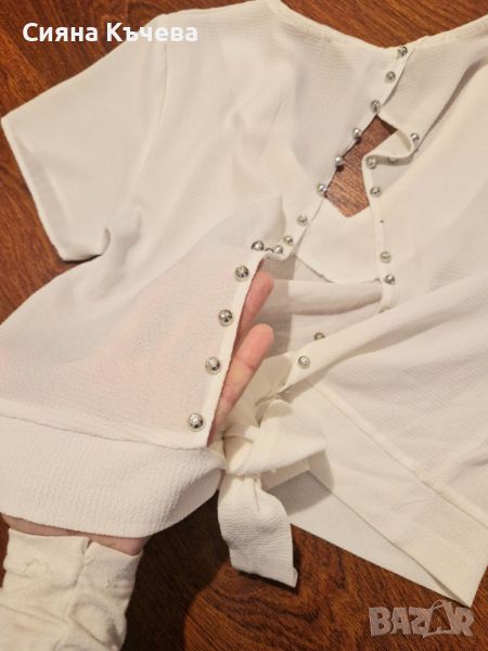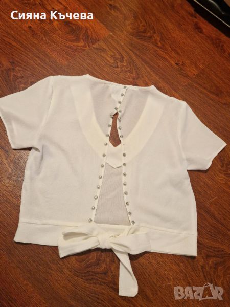 Дамска къса ризка с отворен гръб с камъчета. Връзката на гърба може да се връзва по различни начини стои много ефектно. Носена веднъж, без следи от употреба.