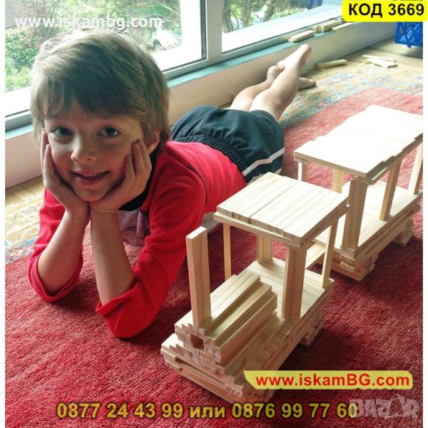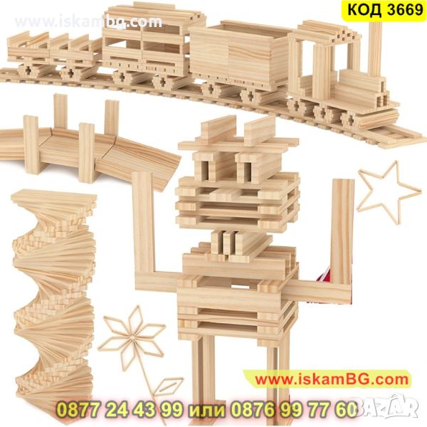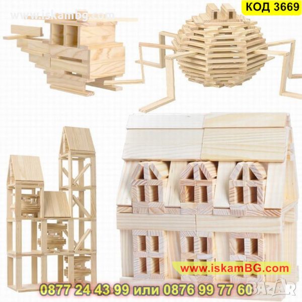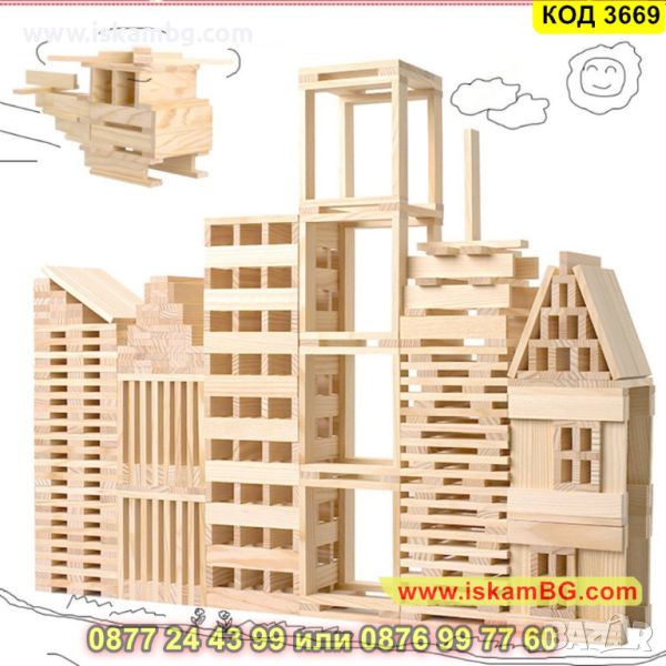 Конструкторът от дървени блокчета е една много полезна игра за Вашите деца, защото ще подтикне тяхната мисловна дейност, мисленето, подобрявайки концентрацията им, сръчността и полагат основни знания в областите математика и физика. Този дървен конструктор е напълно безопасен, защото материалите, от които е направен са нетоксични и възобновяеми ресурси. С тази игра децата ще забравят ползването на телефоните си или таблетите, защото тя е забавна и вълнуваща! Детето Ви ще може да строй различни фигури, къщи, космически кораби, междупланетни станции, небостъргачи, кули и всичко което поиска и за което му стига въображение! С този конструктор пред него няма да има граници. Той се състои от 300 части представляващи дървени блокчета, които нямат нужда от магнити или конектори от какъвто и да е вид, за да се построи нещо трябва само въображение - ако детето Ви го измисли, то ще може да го построи!