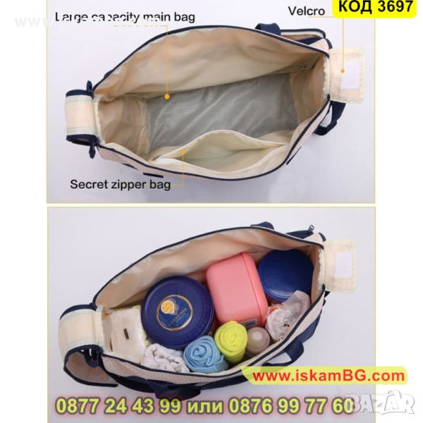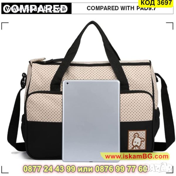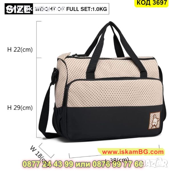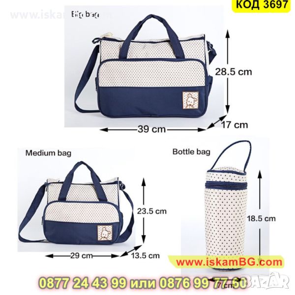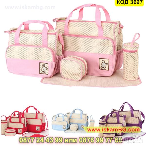 Практичен комплект от 5 бр. чанти, който улеснява опаковането на детски дрехи, играчки, храни и др. Комплектът включва две големи чанти с удобни дръжки за носене, чанта за различни видове храна и чанта за бутилки. При закупуване на комплекта ще получите и постелка за преобличане на вашето дете, когато сте в движение с автомобила или количката. Абсолютно всички части са изработени безкомпромисно с внимание към детайла и от висококачествени материали. Чантите разполагат с дръжки за регулиране, което ги прави много удобни за транспортиране.