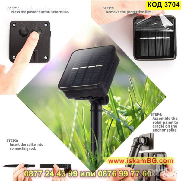 LED соларните гирлянди са чудесен избор за декорация на Вашата градина и различни мероприятия – сватба, кръщене, роден ден или имен ден. Подходяща декорация за тераси, балкони, алеи и други. Лесни са за използване, защото соларните гирлянди имат 19-сантиметрово колче, с което соларният панел се закрепва към всяка мека повърхност с лекота, освен това са и водоустойчиви. Соларните лед гирлянди са изключително икономични, защото енергията, която използват, за да светят е от слънцето – зареждат се през деня за около 6 часа и светят вечер за 8 – 10 часа, след което се изключват автоматично. Батерията която имат е акумулаторна и се намира в слънчевия панел. Соларният панел притежава и превключвател ON/OFF за управление на включване/изключване и за настройка на режима на осветление, който може да бъде фиксиран или периодичен и дава допълнително удобство. Висококачествените водоустойчиви материали, от който е направен нашият продукт позволяват той да издържа на всякакви атмосферни промени –замръзване, сняг, дъжд, прах. За да се монтира не са необходими кабели.