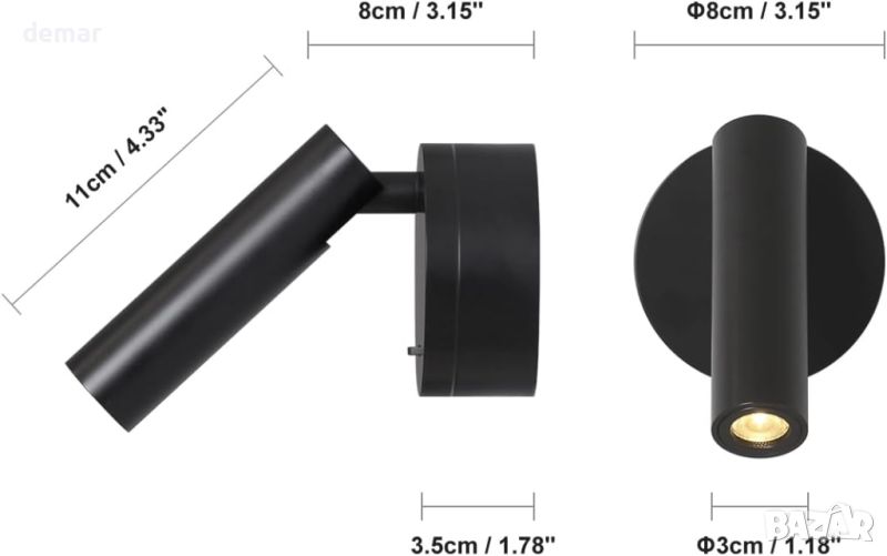 Въртящата се стенна лампа разполага с въртяща се на 320° и регулируема на 90° LED лампа за стена, което я прави идеална лампа за четене за използване над легла и дивани. Той излъчва топла бяла светлина при 3000K от 3W LED, предназначен да предпазва очите и да създава уютна атмосфера в спални, дневни, коридори, кухни и кабинети, както и в търговски помещения като хотели, офиси, музеи, галерии, и ресторанти. Модерният дизайн включва кръгла основа и цилиндричен прожектор в черно, изработени от висококачествен алуминий за отлична устойчивост на топлина и ръжда. Включва удобен тесен превключвател за лесна работа от легло или диван. Необходима е инсталация, тъй като се свързва директно към електрическата мрежа.