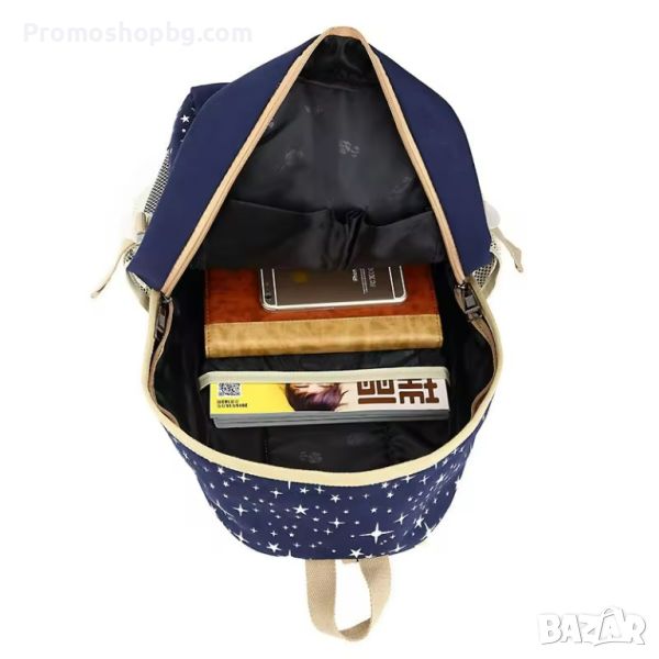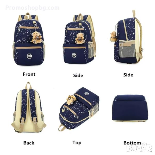 Комплект се състои от 3 части - раница с размери: 44х27х17 см, чанта за рамо с размери: 24х20х7 см и несесер с размери: 19х12 см.
