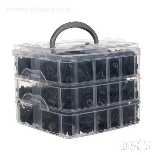 Този универсален комплект включва 620 щипки в 18 различни размера и 5инструмента за премахване. Щипките са направени от здрав полипропилен (PP), който е устойчив на механични повреди и атмосферни условия. Комплектът идва в практична пластмасова кутия с три нива и дръжка за лесно пренасяне.
