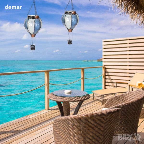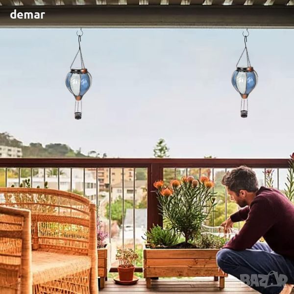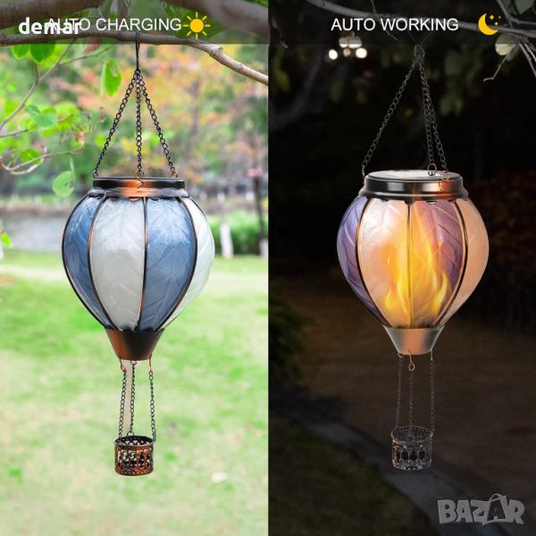 Тази висяща соларна лампа се отличава с уникален дизайн на балон с горещ въздух с шест парчета синьо и бяло стъкло, които излъчват реалистични пламъци, добавяйки топлина и комфорт към вашата градина, вътрешен двор, двор или пътека - идеални като декоративни коледни лампички. Захранван от слънчева енергия, той е едновременно енергоспестяващ и екологичен, като ви помага да спестите разходи за електроенергия. Уверете се, че превключвателят на захранването е включен преди зареждане; фенерът автоматично ще се включи при здрач и ще се изключи при зазоряване. Фенерът с балон с горещ въздух включва верижна кука за лесно окачване на веранди, дървета, перголи или балкони, подобрявайки елегантността и цвета на вашите външни пространства. Идеален е за подарък за приятели и семейство. Оценен като водоустойчив IP44, той е подходящ за употреба на закрито и на открито, дори при дъждовни условия, и не съдържа вредно лъчение. Въпреки че е направен от стъкло и е потенциално чуплив, той обещава издръжливост при внимателен монтаж.