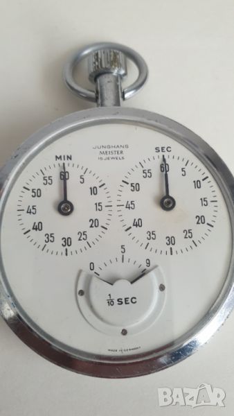 Хронометър Junghans Meister, ретро ръчен вятърен хронометър, рали хронометър, спортен таймер, добре работещ,диаметър 55мм.Механичен механизъм, калибър 628/01, 15 камъка, 1/10 сек., механизъм за фина настройка, ръчно навиване. Този дизайн на хронометъра отчита директно в минути, секунди и десети и никоя от стрелките не покрива нищо друго.Произведено в Германия около 1960-70-те години.Този хронометър се навива, стартира, спира, нулира и работи правилно.