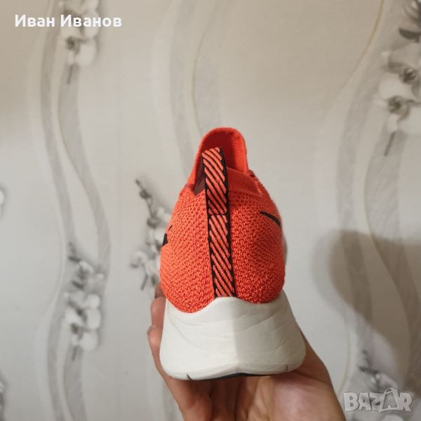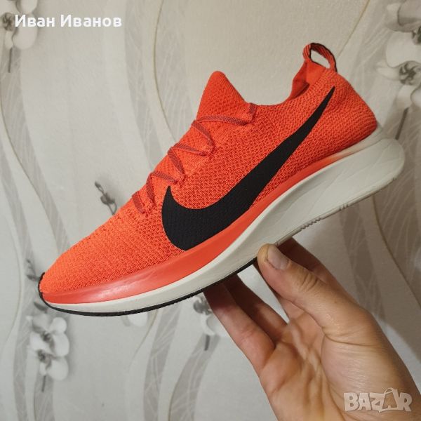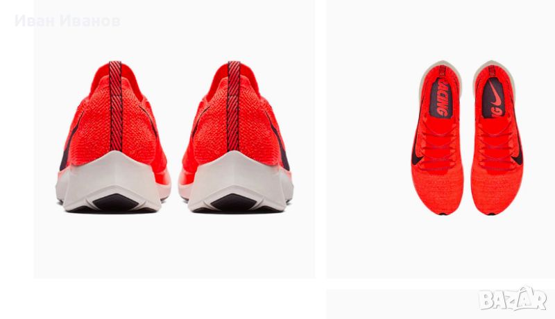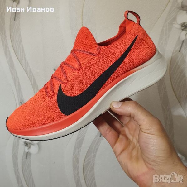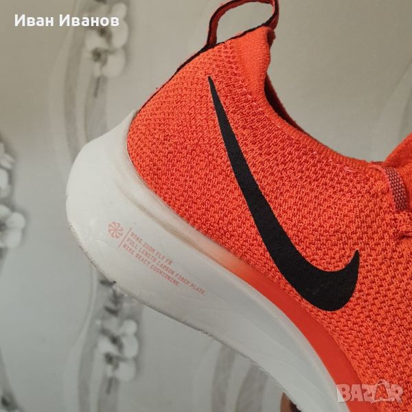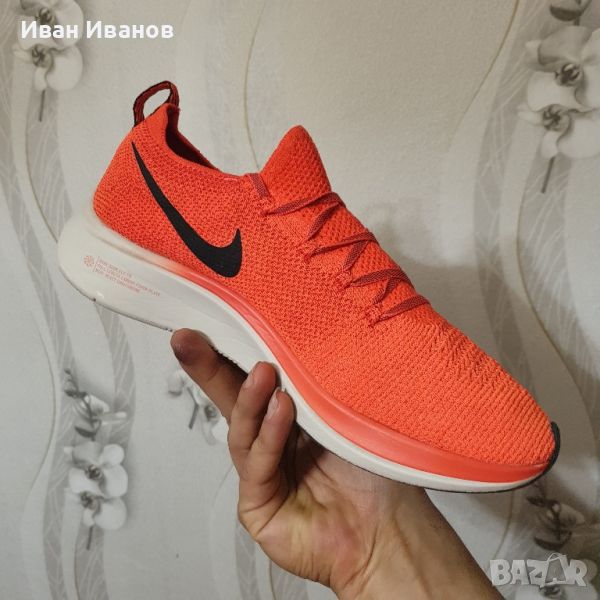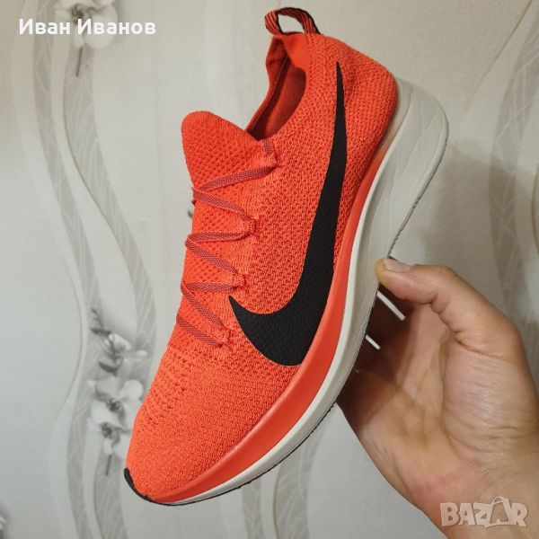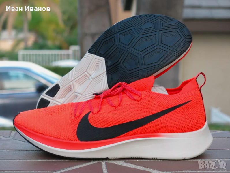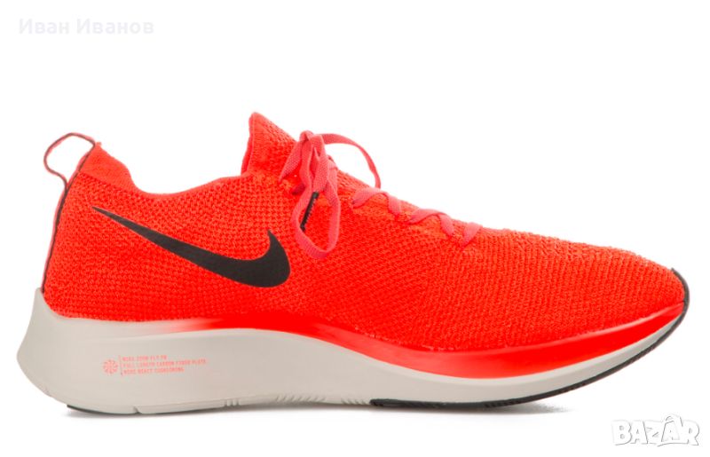 Nike Zoom Fly Flyknit Bright Crimson.Малко използвани , външно като нови , с минимални следи по подметката .Много красиви , леки и удобни Nike Zoom Fly Flyknit е създаден за рекордна скорост. Горната част от Flyknit осигурява ултра лека опора с прилягане като чорап. Под краката технологията Nike React се комбинира с плоча от въглеродни влакна по цялата дължина, за да осигури революционно връщане на енергия.Характеристика:Технологията Nike React осигурява меко, отзивчиво каранеКонструираната горна част от Flyknit осигурява лека дишаемостПлочата от въглеродни влакна с пълна дължина придава щракващо усещанеВътрешният ръкав приляга плътно, подобно на чорапТопимите прежди създават зони на структура и опора, без да добавят теглоМоделът на сцепление използва различни форми и размери на ушите, за да осигури стабилност и задвижване от земятаТегло: 240грПадане: 10 мм