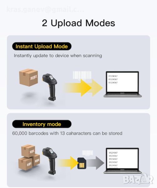 Интелигентна станция за зареждане, по-дълъг живот на батерията: Pro 8 се предлага с извита докинг станция за зареждане, която действа като безжичен адаптер за пренос на данни, докато зарежда скенера за баркод, за да осигури непрекъсната работа през целия ден. Пълно зареждане на батерията издържа до 2 дни работа.