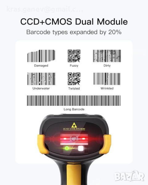 Inateck Bluetooth баркод скенер, 2D 1D безжичен ръчен скенер