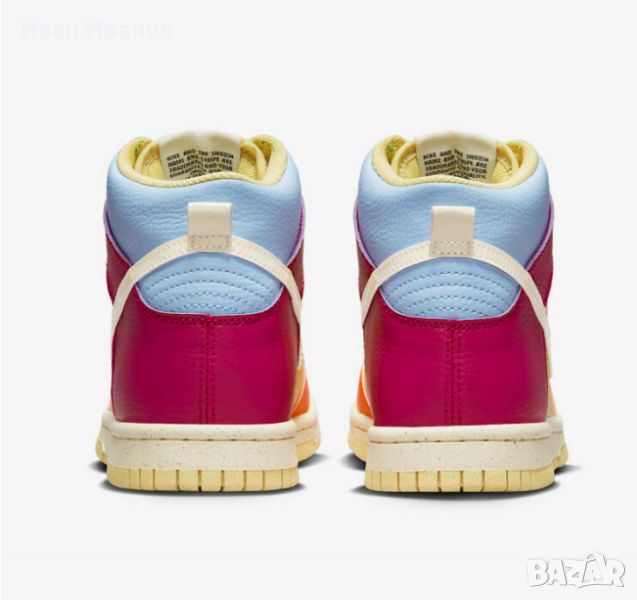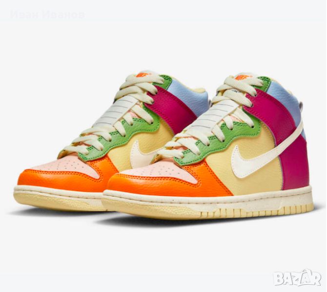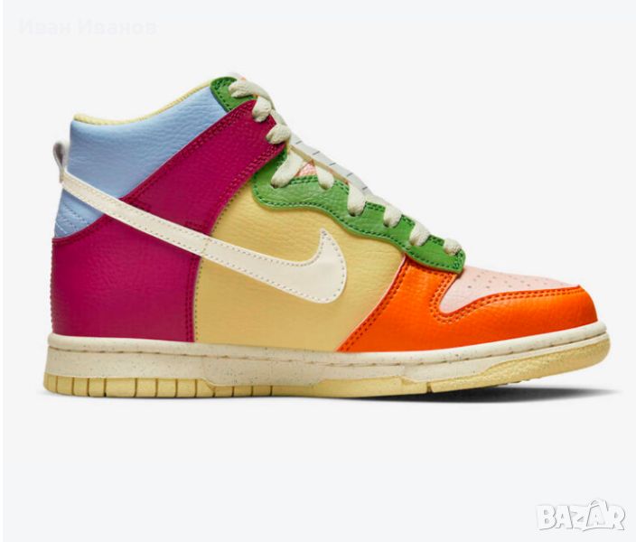 NIKE DUNK HIGH NN GS IGDЧисто нови . Цена по магазините около 220 лева . Дължина на стелката 23 см Nike Dunk High Next Nature GS „Multi“ са облечени от главата до петите в живи нюанси на фуксия, оранжево, праскова, светло синьо, зелено и жълто. От гледна точка на конструкцията, чифтът е изграден с горна част от изцяло извита кожа, съчетана с мрежести езици и гладки кожени Swoosh наслагвания. Завършващите финални детайли са удълженият етикет на езика и двуцветната гумена подметка. Nike Dunk High постигна много през 37-те години от дебюта си. През последните няколко години емблематичният дизайн на Peter Moore положи съгласувани усилия да се хареса на по-младите колекционери на маратонки в семейството., новообновеният стил се отдава на комбинация от тонове на всеки от панелите на горната част: оранжево оживява наслагването на предната част на стъпалото, докато колегите по протежение на езика и на петата въвеждат всичко от наситено зелено до нежно синьо. Профилните пръчици поддържат подобие на простота, като се има предвид тяхната мръсно бяла подредба, съответстваща на капака, подобен на хартия за тефтер, покриващ част от връзките на Nike Dunk. Подметките, напомнящи на Air