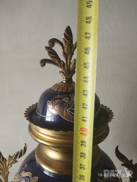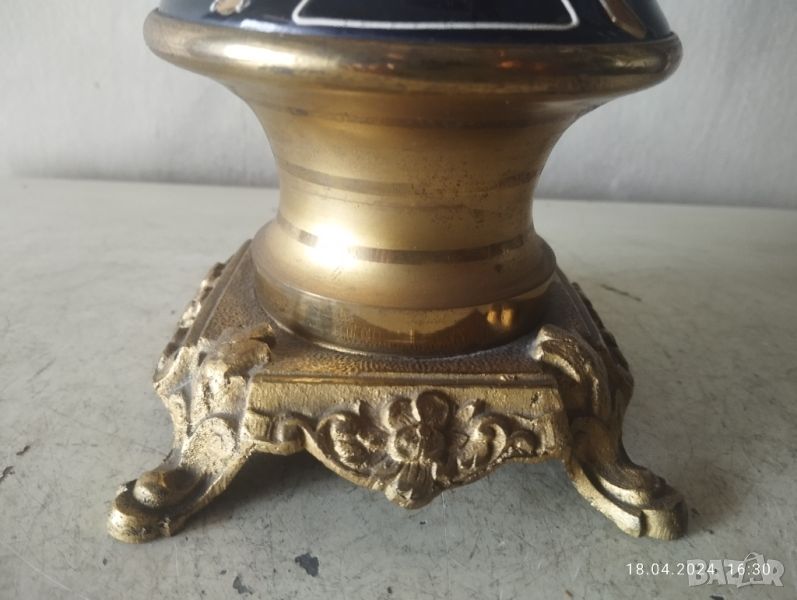 Порцелан с позлатен бронзов обков.Пукнато стъкло на циферблата,липсва ключе.Не знам дали работи.