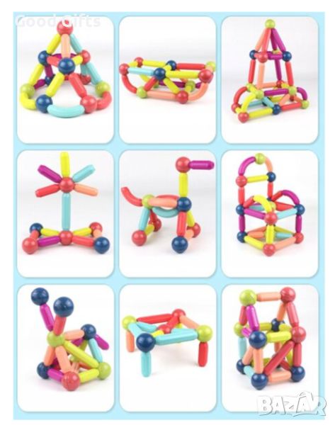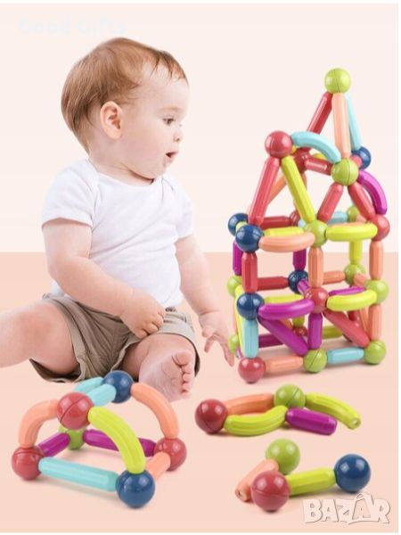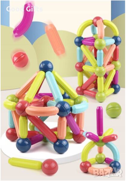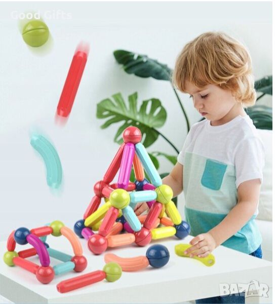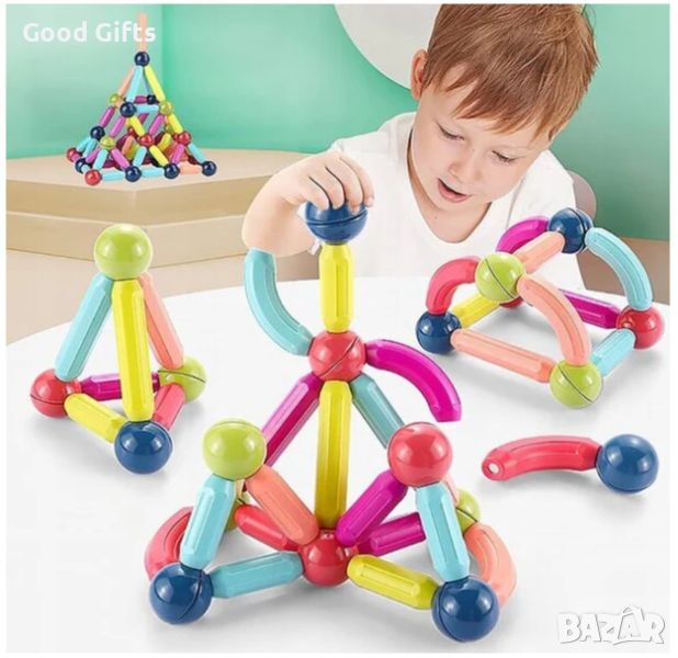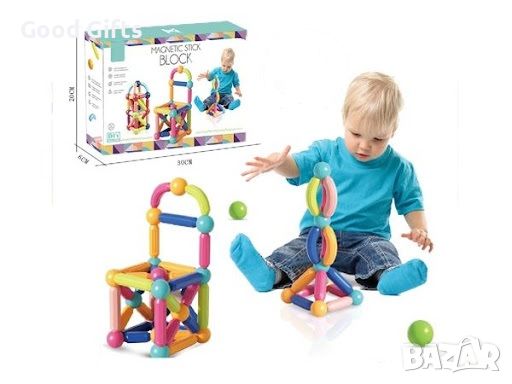 Магнитен конструктор, 66 части, Магнитни пръчици и топчетаЦветен комплект от големи магнитни блокчета е чудесен подарък за всяко дете, което обича творческата игра!Големият брой части с различни форми ще ви позволи да прекарате много часове страхотно забавление. Приятните за окото цветове допълнително ще насърчат всяко дете да играе.Магнитният конструктор е страхотна образователна играчка - той развива креативността на вашето дете, учи го на търпение и концентрация. Детето ще тренира моториката на ръцете и координацията на очите. То ще се научи да различава цветовете или да съчетава елементи. Забавлявайте се и учете едновременно!Частите се характеризират с лекотата, с която отделните елементи могат да бъдат свързани по всякакъв начин и под различни ъгли. Ръбовете на всеки блок са оборудвани с магнити, които ги свързват заедно, за да образуват различни фигури. Частите могат да бъдат подредени плоско, за да образуват пътеки, змии и т.н., или пространствено, за да образуват различни триизмерни фигури. По този начин децата ще могат да стимулират своето пространствено въображение.Поради големия си размер блокчетата са идеални дори за по-малки деца от 3 годишна възраст.Елементите от комплекта са без остри ръбове, напълно загладени и безопасни.Целият комплект се предлага в оригинална опаковка в цветна кутия, подходяща за подарък!Блоковете могат да се комбинират с други комплекти от същата серия.