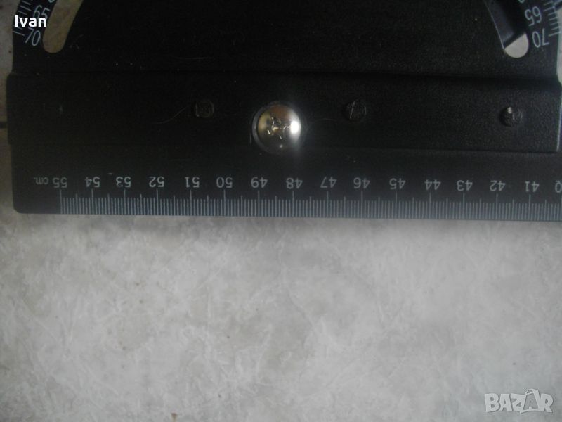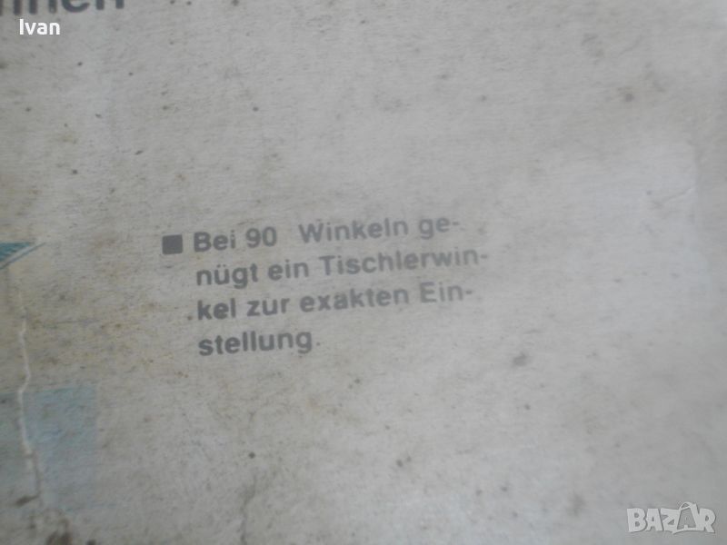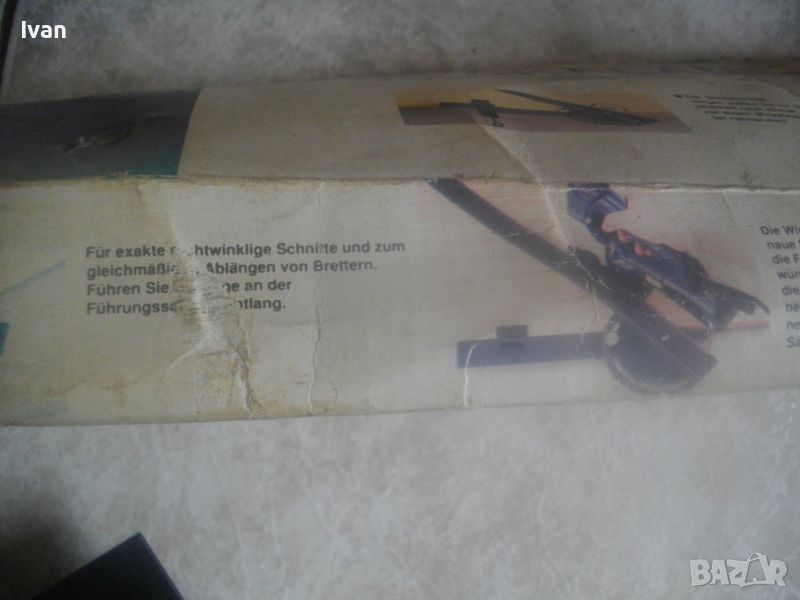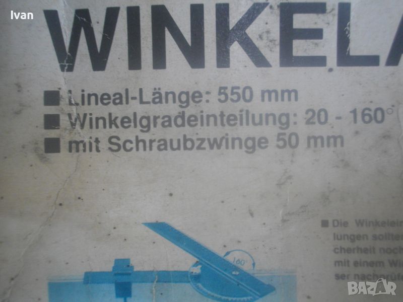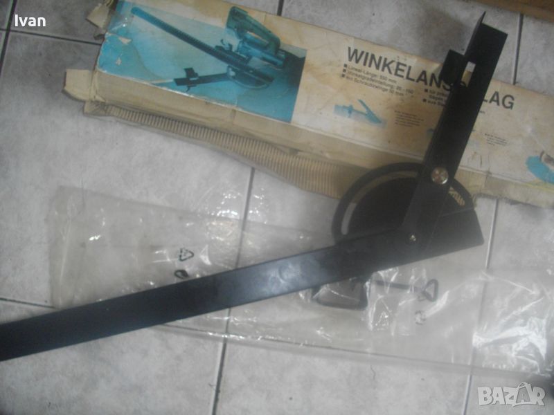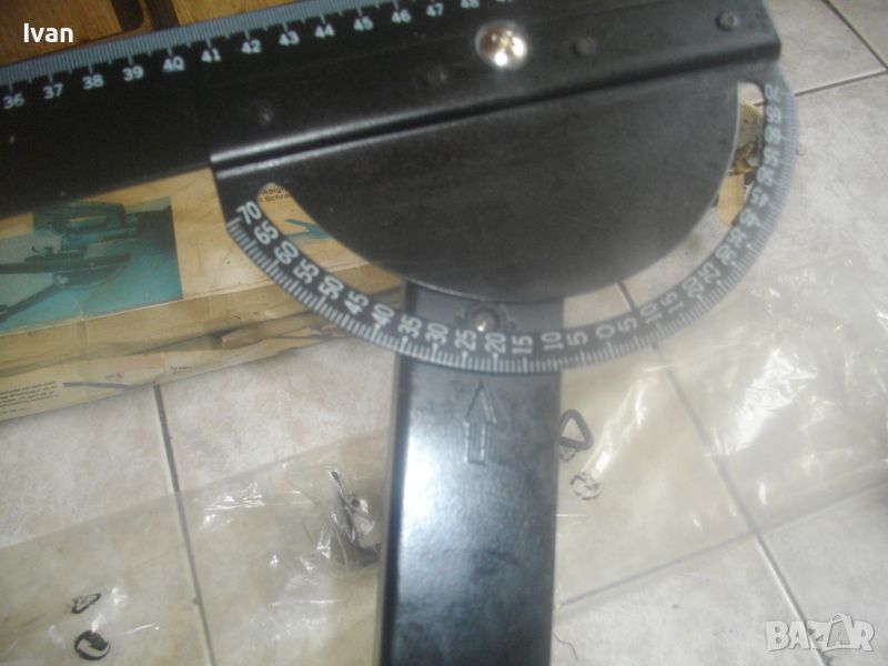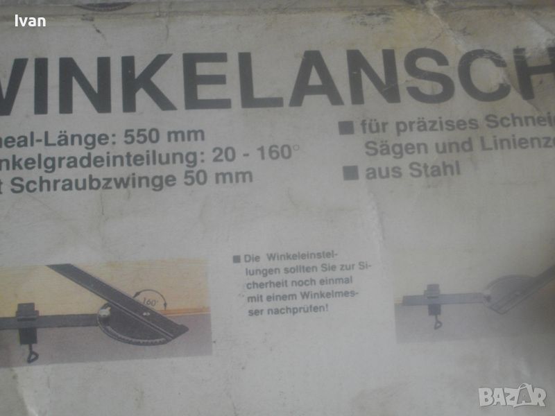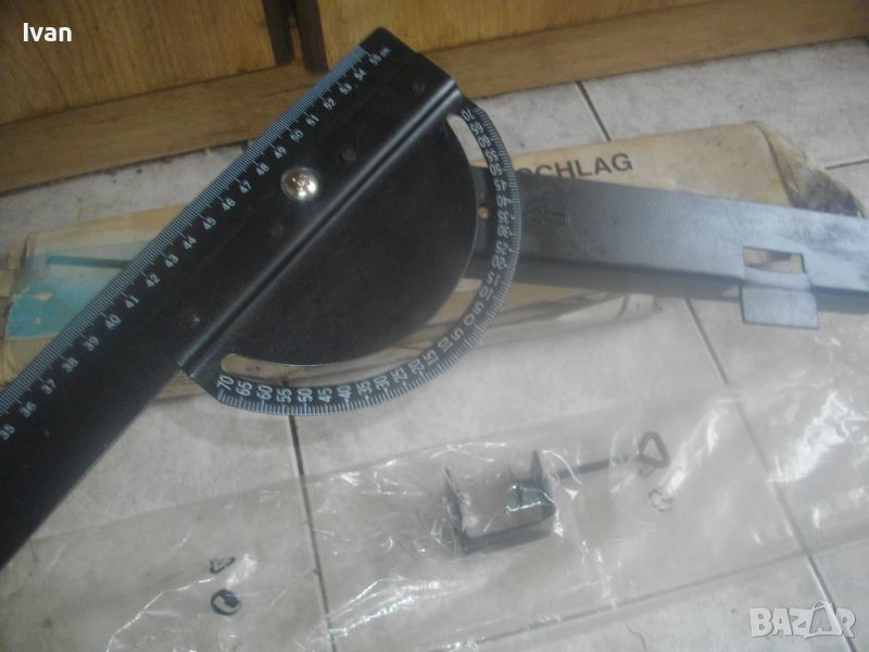 ОПИСАНИЕ на ръчен водач линеал за рязане под ъгъл за машина вертикален прободен трион зеге и за други подобни режещи машини - цена 79 лв. Немски оригинален. Съвсем нов, неиползван и неупотрбяван, в оригиналните си найлон и картонена опаковка кутия /леко разкъсана/. Професионален тип водач за прецизно и точно рязане под определеен градус и ъгъл. Към водача има голяма масивна стяга, с която се захваща към работна маса и по водача се реже с машина работната повърхност, която искаме да режем. Маркировки и вписвания - Lineal Lange - 550 mm. Winkelgradeinteifung 20-160 градуса. Mit Schraubzwinge 50 mm. Fur Prazises Scheidensagenung Linienzeichnen. Aus Stahl. Скалата за ъглово рязане е разграфена 0-70 мм прециизно през 1 мм. Дължина цялостна на инструмента 590 мм, разграфен линеал до 550 мм през 1 мм. Материал на водача скала - масивно дебело желязо. Стягата също е масивна. Захват на стягата до 60 мм отваряне. Градуси 20-160/ +/- 0-70. Наименование на водача -Winkelanschlan. Тегло на водача - 1,2 кг. Цена 79 лв.