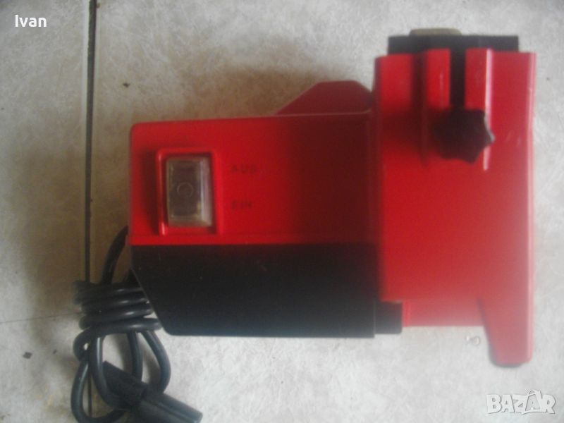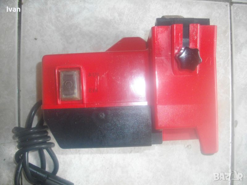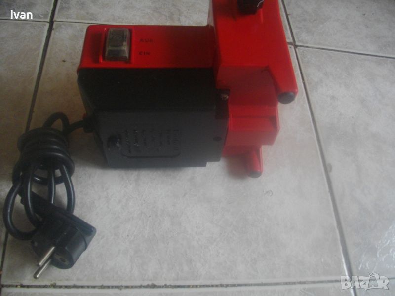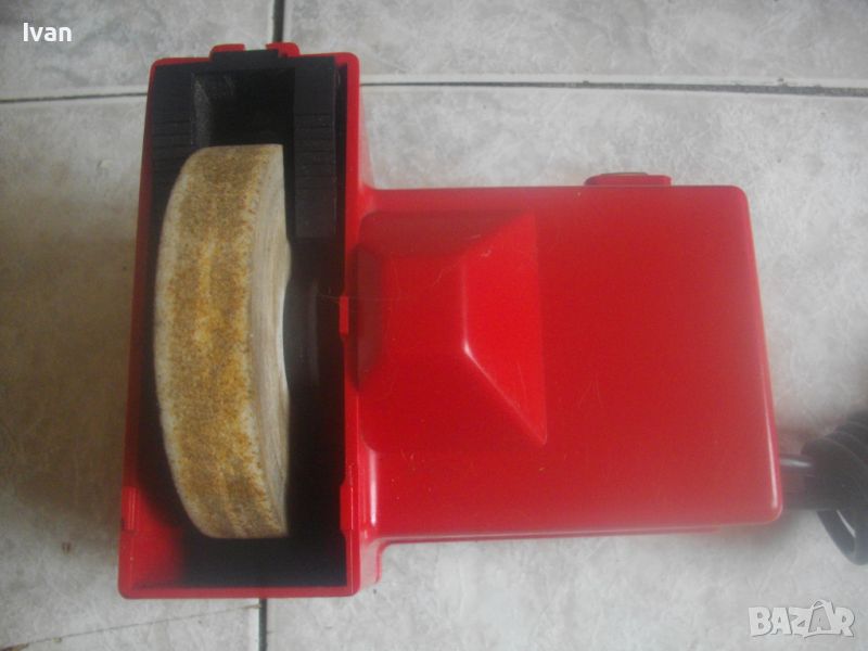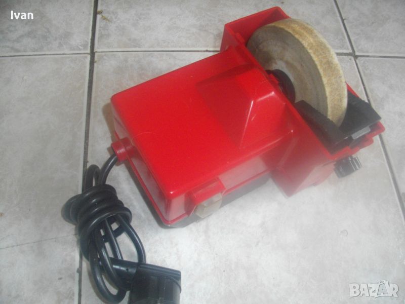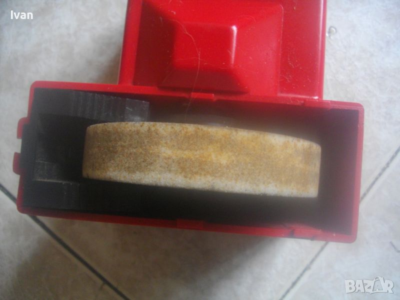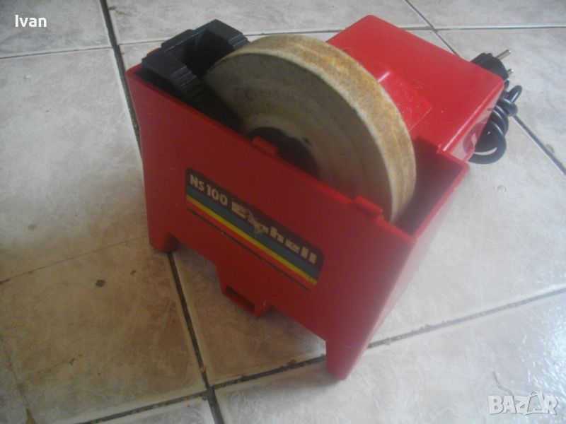 ОПИСАНИЕ на електрически червен мини шмиргел с бавна скорост за заточване остриета на водна основа - цена 199 лв. Немски оригинален, марка и модел Einhel Typ NS100. Почти нов, с много запазен външен вид и отлично работно техническо състояние. Без забележки. Мощност на мотора 45 вата, скорот 250 об/мин. За камъни дискове заточващи шлифовъчни размер универсален 100 х 20 х 16 мм. Шмиргела е с поставен почти нов бял мек шлифовъчен оригинален камък диск. Предеен дълбочинен регулируем предпазител пред диска в горна част на ваната за вода. Вана за вода - вградена, еднокомпонентна с корпуса на машината. Преден пусков ключ със силиконово антипрахово покритие AUS-EIN. Време на пускане с 1 пуск, упоменато на машината - 10 мин. Дължина на шмиргела - 130 мм, ширина 170 мм, височина 140 мм. Тегло - 1,8 кг. Цена 199 лв. Абсолютно твърда цена, без коментар.