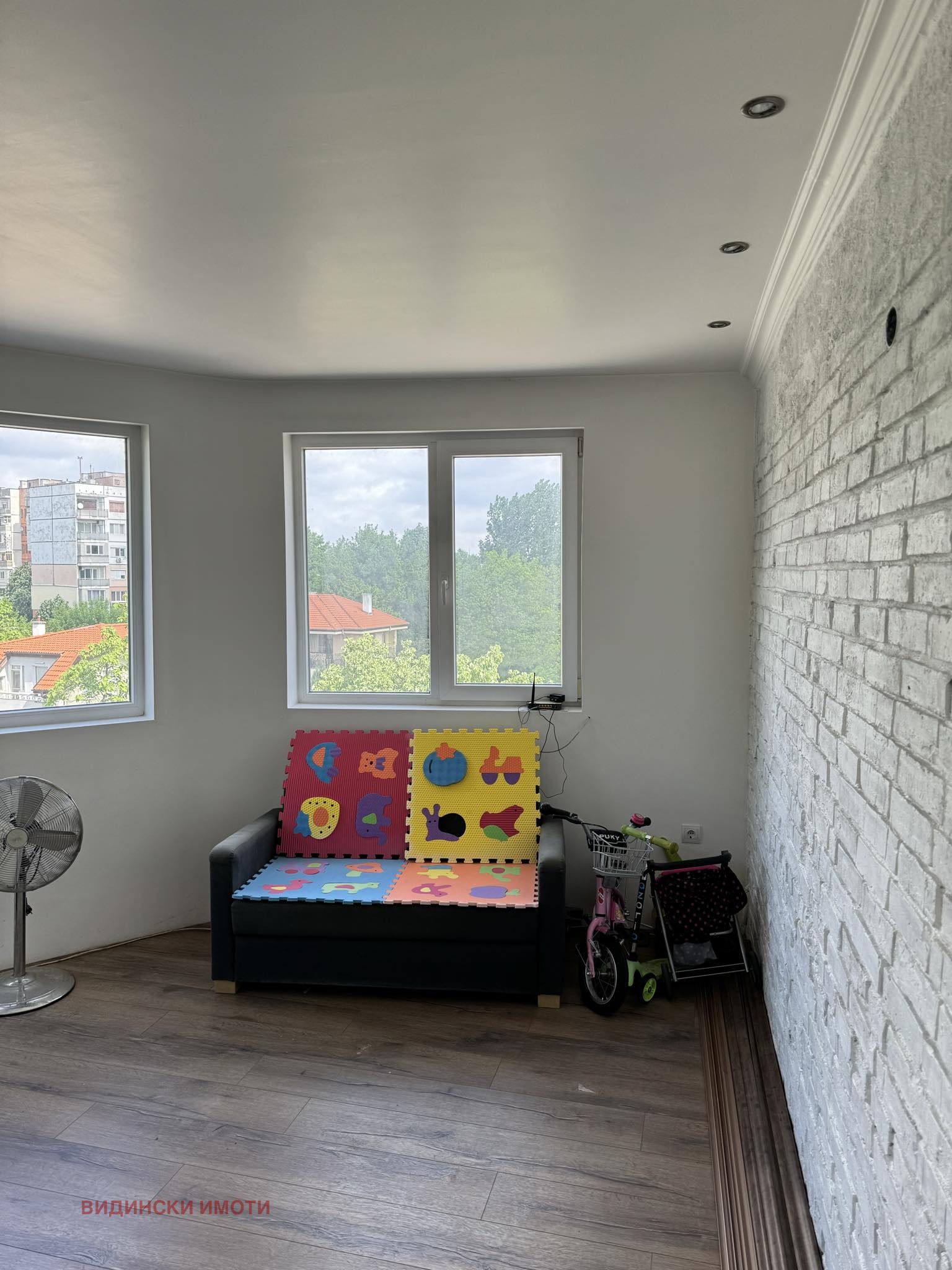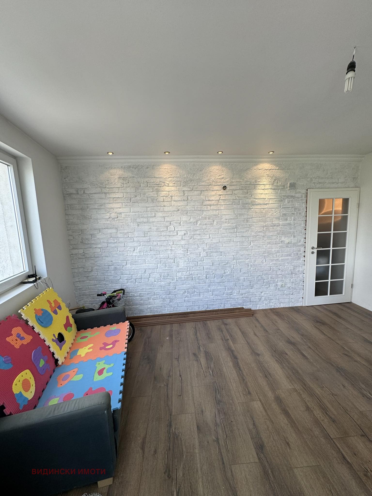 * дневен трак (кухня, трапезария и хол) - пода е ламинат, стените с декоративни тухли, шпакловано и боядисано с латекс