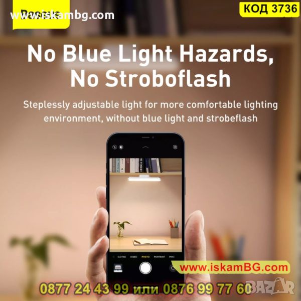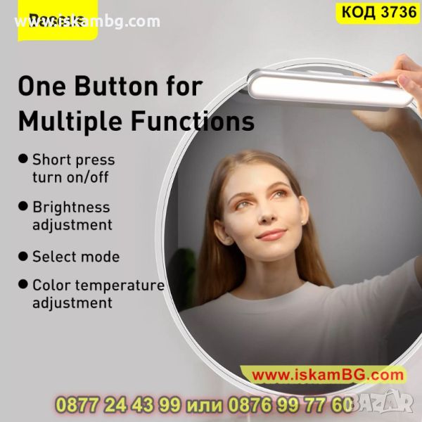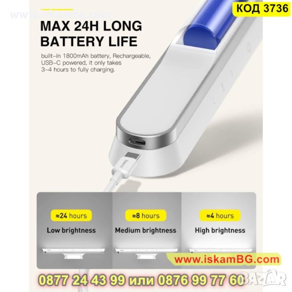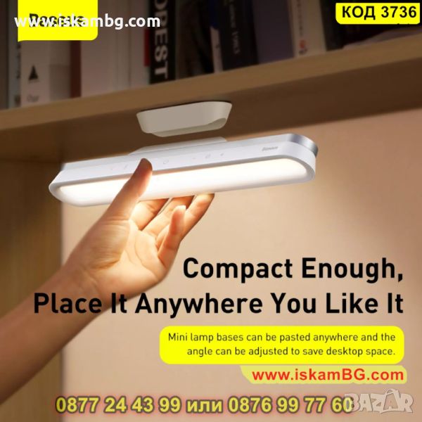 Избирайки безжичната лампа с магнитна стойка ще се насладите на удобство и комфорт по всяко време у дома. Лампата е стилна и ефективна. Благодарение на магнитния си корпус, тази лампа може да се прикрепя към всякакъв метални повърхности, хладилник и други мебели. Поставя се чрез самозалепваща лента на стойката. Позволява да се задава желан ъгъл на осветяване – безжичната лампата има възможност за регулиране в диапазона от 80 градуса. Зарежда се бързо и лесно и позволява включване докато трае зареждането й. Има батерия 1800 mAh, осигуряваща работа до 24 часа - на ниска мощност, 8 часа - на средна мощност и 4 часа - на максимална мощност. Лед лампата се зарежда, като се свърже към компютър, power bank или други устройства. И това не е всичко! Baseus лед безжична лампа предлага три режима на работа: - студена светлина (5000K) - за работа и учене; неутрална светлина (4000K) - за четене; и топла светлина (3000K) - за игри и гледане. Тази лампа е преминала теста EU Blue Light RGO, а корпусът й притежава сензорни тъч бутони, с които се контролират настройките на лампата.