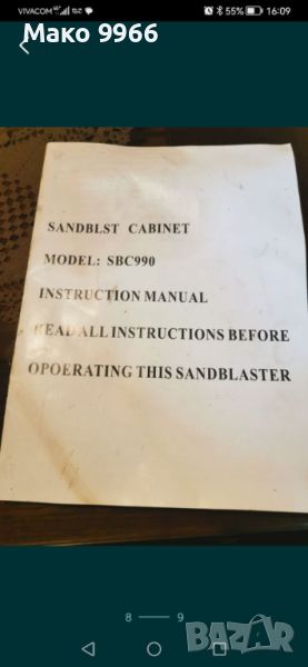 Пясъкоструйка SBC990 беше закупена от Германия преди няколко години. Използвана е за чистене на джанти и детайли! Пистолета е закупен отделно на цена 600лв който е изработен от специален материал и е вечен, не изисква подмяна на камените дюзи. В кабината има около 150-200кг желязни стружки с който се работеше. Цената е за всичко.