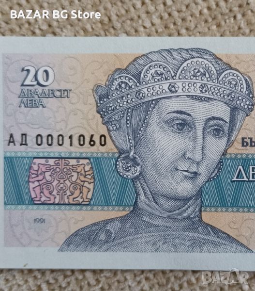 Българска банкнота 20 лева Десислава Севастократорица. Номер АД 0001060. За колекционери и ценители.