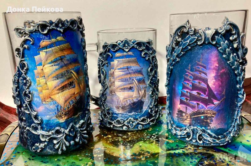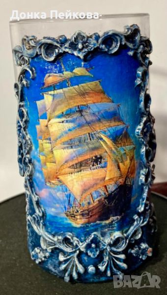 с техника декупаж и студен порцелан. За изработката са използвани безвредни бои и материали, препоръчвам само ръчно миене с топла вода и мека гъба. Продукта е единствен и това го прави уникален. Прекрасен подарък за рожден ден, сватба, годишнина, абитуриенти-