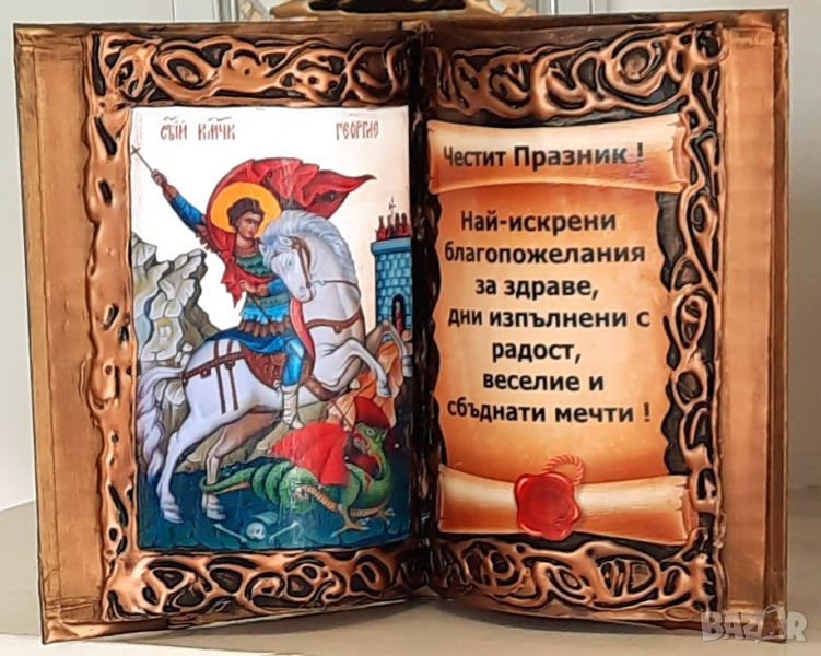 Авторски, ръчно изработен комплект от книга-икона със Св. Георги и оригинално пожелание за всеки повод, и празник - рожден или имен ден, юбилей, Гергьовден и др. в съчетание с бутилка Дървото на парите / живота.