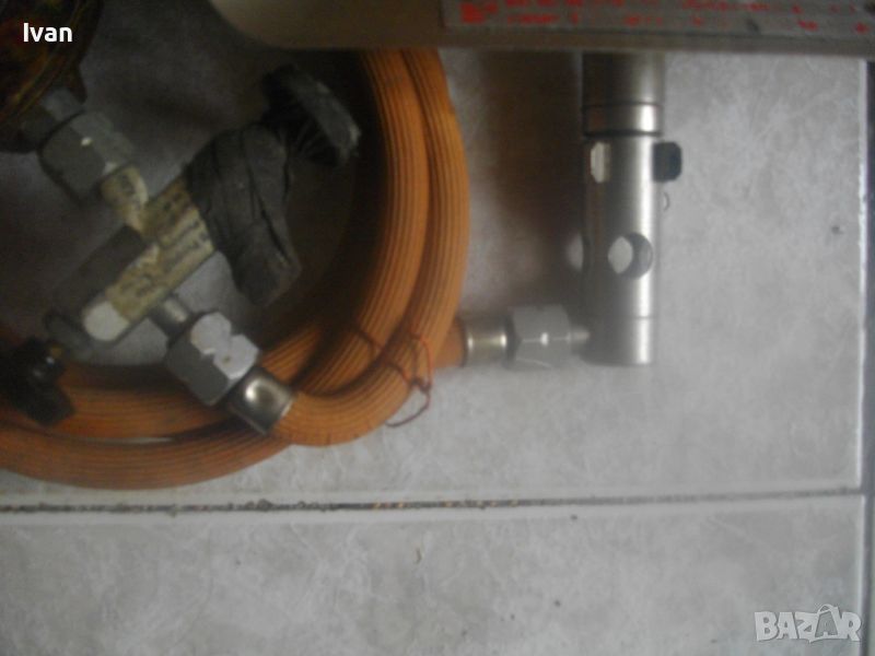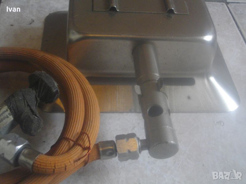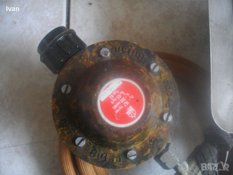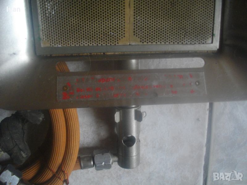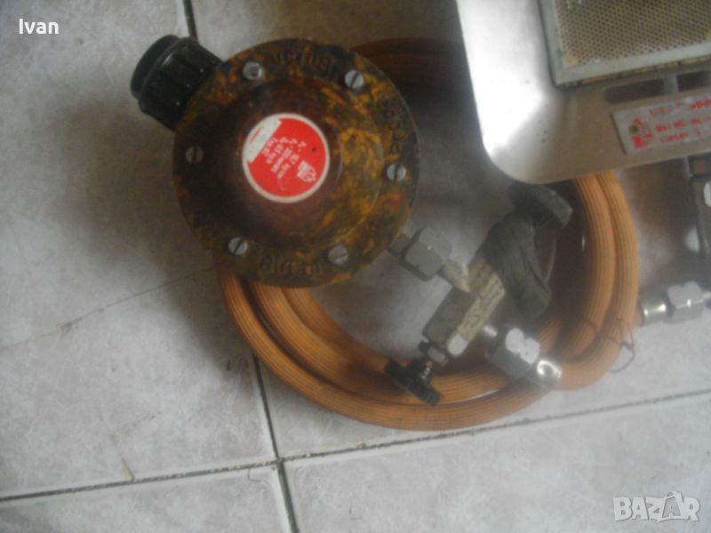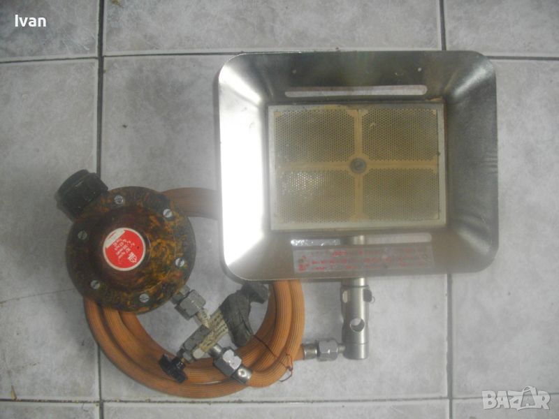 ОПИСАНИЕ н малък газов отоплител керамичен тип пита за газ пропан-.бутан. Цена 99 лв. Немски оригинален старо качество, масивен. С въртяща се изцяло масивна метална стойка. Размери на рефлектора 195 х 165 мм, размери на керамичната отоплителна пита 135 х 100 мм. Цялата керамика на питата е в отлично състояние, без забележки. Маркуч скачен 1,5 м. Вентил скачен старо качество, професиионален, масивен - голям размер ф 100 мм, изцяло от бакелит, немски оригинален. Характеристики на вентила - 16,7 кг/см, Pn-300 mm WS, Qn- 0,5 kg /h, Typ KC. Тегло на всичко - 1,5 кг. Цена на всичко - 99 лв.