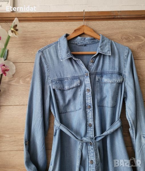 Дънкова рокля тип риза с коланче и джобове. Размер S, подходяща и за М. Дължина 90см, гръдна 98см.