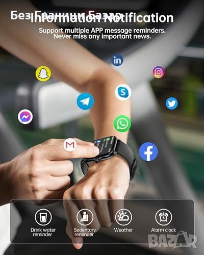 Допълнителни Функции: Контрол на музика, прогноза за времето, напомняния за седене, дистанционно управление на камера, аларми, хронометър.