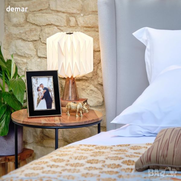 Изработена от изискани материали, тази лампа съчетава естествената топлина на манговото дърво с деликатното майсторство на сгъната хартия. Универсален в своето приложение, той безпроблемно се вписва в различни жилищни пространства като всекидневни, спални, кабинети или входове, допълвайки различни интериорни стилове. Съвместим с енергоспестяващи E14 крушки с винтово монтиране, той предлага както екологично съзнание, така и практичност. С прост превключвател за включване/изключване, разположен на кабела, работата е лесна. Освен осветителната си функция, тази лампа се удвоява и като елемент от декора за разговори, като се гордее с поразителен дизайн, който привлича вниманието и повдига всяко пространство, което заема.