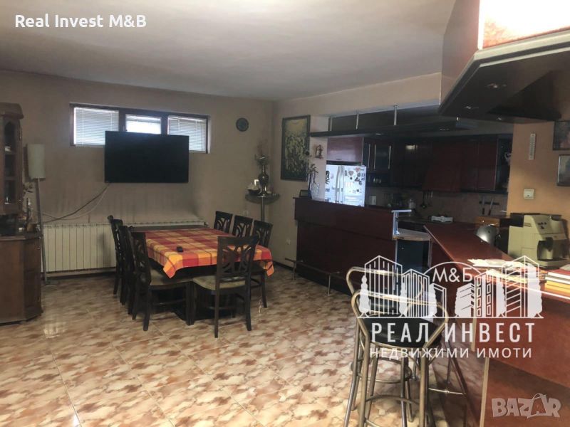 Първи етаж- просторно помещение с дневна с камина , трапезария с бар и напълно оборудвана кухня