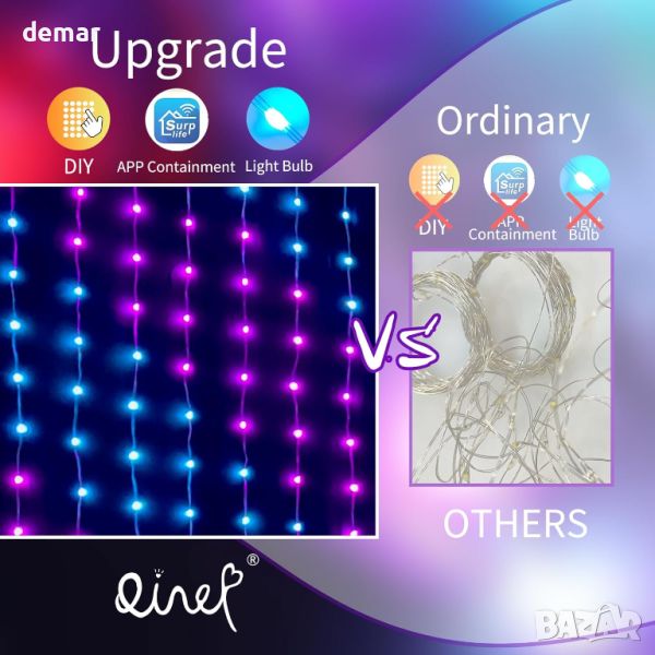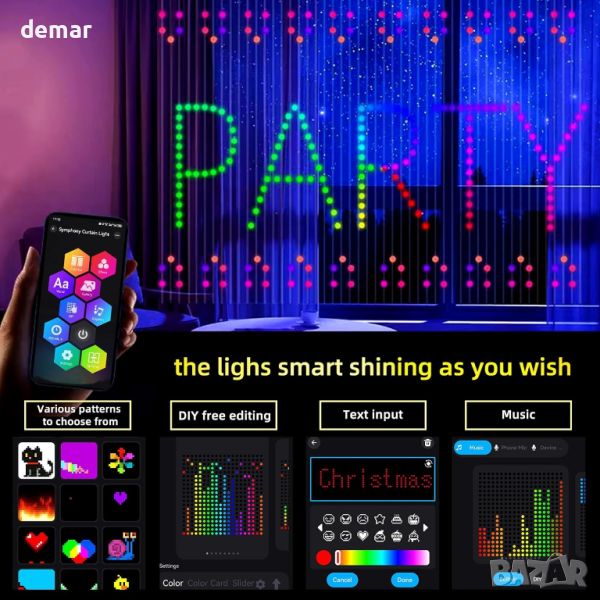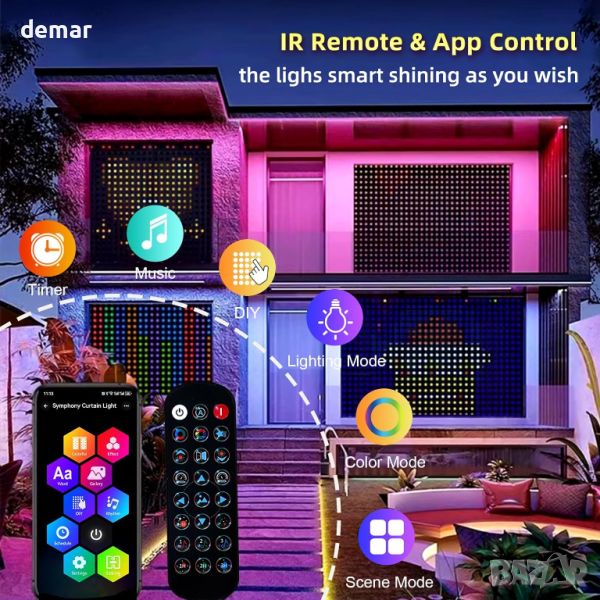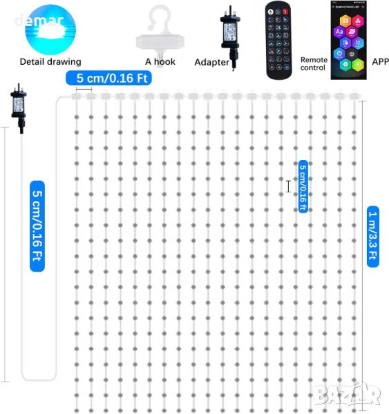 1x1m светлини-завеса, включващи вградени независими контролни чипове за динамични цветни дисплеи и сценични режими, наподобяващи дъга. С динамична и статична технология за управление, таймер и режим на свързване, можете без усилие да управлявате до 5 комплекта едновременно за вашия мечтан дом. Насладете се на дистанционно управление чрез нашето интуитивно приложение, предлагащо персонализиране на 16 милиона цвята, яркост и скорост, заедно със 17 различни светлинни ефекта. Вграденият микрофон с висока чувствителност синхронизира светлините с музиката, създавайки потапящо изживяване, което танцува в ритъма. Бъдете креативни с опциите „Направи си сам“, изработвайки уникални шрифтове, картини и цветове, които да отговарят на вашето въображение. С водоустойчива функция IP65 за кабела със светеща нишка, тези завеси са идеални за употреба на закрито и на открито, добавяйки чар към поводи като Свети Патрик, Свети Валентин, Хелоуин и др. Идеални за прозорци, спални, партита, градини и тържества, тези светлини-завеси внасят магия във всяка обстановка.
