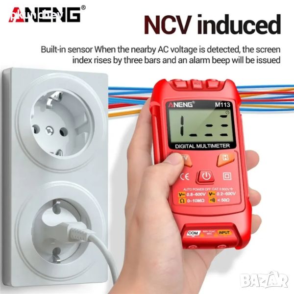 4.Безконтактно индукционно захранване за откриване на NCV: Когато вграден индуктор открие близко променливотоково напрежение, индексът на екрана ще се повиши три пъти и ще прозвучи звуков сигнал за аларма