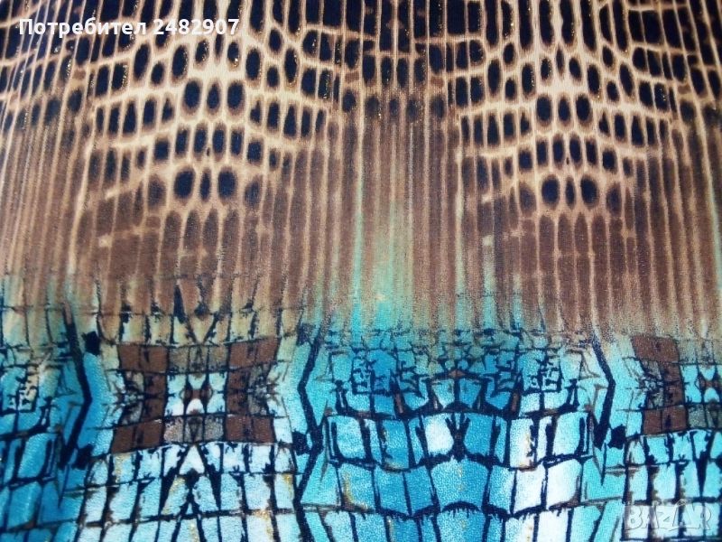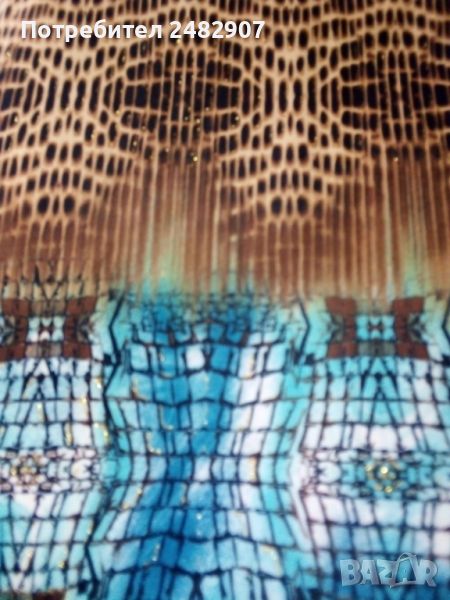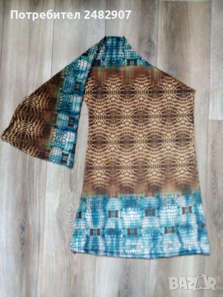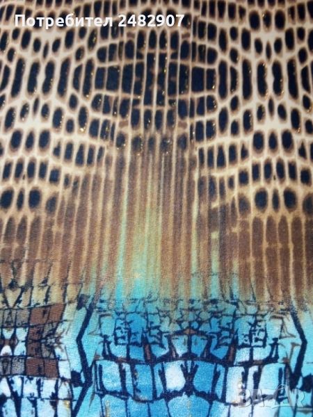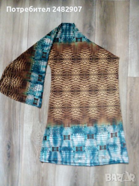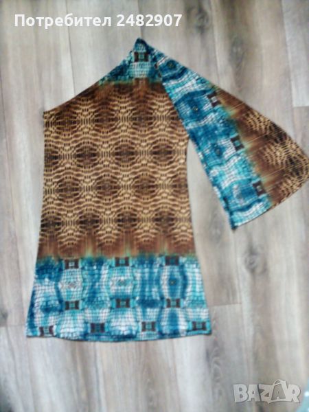 Ефектна асиметрична дамска туника с един ръкав, размер М. Съдържа 95 % полиамид и 5 % еластан. Ширина под мишниците - 42 см, ширина в долната част - 50 см, дължина от рамото до долу - 82 см, дължина на ръкава от деколтето - 59 см, ширина на ръкава в долната част - 29 см. Чисто нова, не е използвана, само е пробвана. Изключително мека и приятна на допир, с малки блестящи частици в златисто.