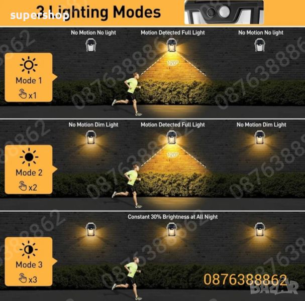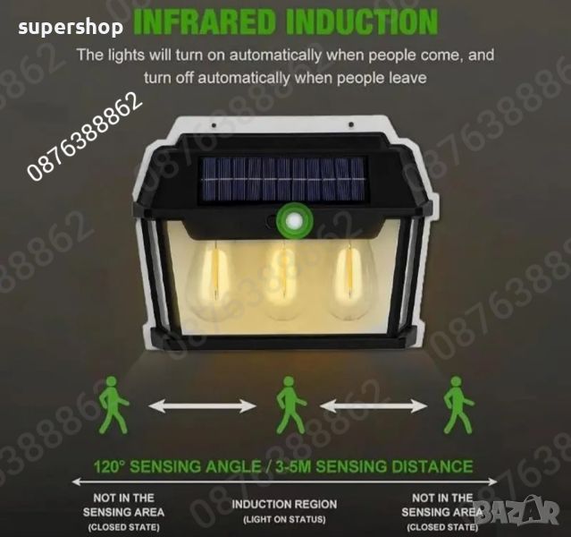 Соларна стенна лампа за външен монтаж, 38 вата, чувствителен PIR сензор той може чувствително да разпознава яркостта на заобикалящата среда и автоматично да се изключва при зазоряване и да се включва при здрач.