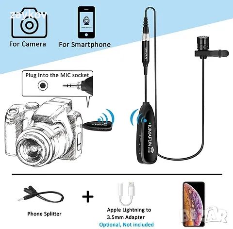 Този комплект безжични микрофони може да се използва в повечето устройства. Пакетът включва телефонен сплитер за смартфон (включен телефон с Android и iPhone), USB звукова карта за лаптоп/PC/Macbook и 6,35 мм (1/4") адаптер за PA/високоговорител. Когато вашият смартфон няма 3,5 мм (1/8") гнездо за аудиовход, моля, поръчайте и използвайте адаптер тип-c към 3,5 мм. Микрофонът е подходящ за преподаване, екскурзоводство, видео/аудио запис, интервю, vlog, предавания на живо и др.